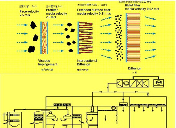 空調送風系統通過一定的流速將灰塵送到過濾系統當中,初級過濾器將5um以上大顆?;覊m留在過濾表 面,中效過濾器將1um-5um顆粒抓取,高效過濾器將0.3um-0.5um以上灰塵顆粒過濾,從而保證無塵車間等級!