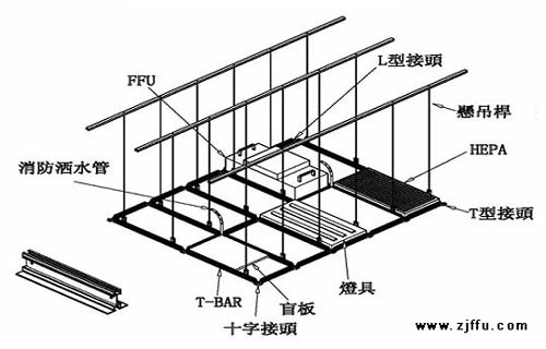 FFU風機吊頂龍骨系統是指用鋁合金做成的,用于潔凈室天花吊頂的主材料,它通過螺桿與鋁合金相接,用來固定FFU。適用于局部層流系統、FFU系統和不同潔凈級別的空氣凈化系統。