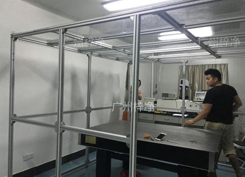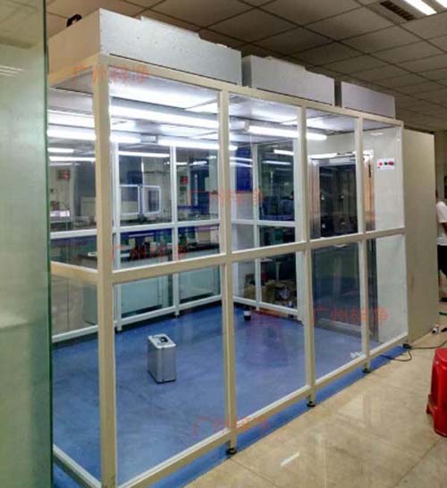 千級(jí)潔凈棚(1000級(jí)潔凈棚)采用工業(yè)鋁材(或不銹鋼方通、鐵方通噴塑)作為框架,風(fēng)機(jī)濾網(wǎng)機(jī)組(FFU)送風(fēng),四周懸掛防靜電垂簾(或鋼化玻璃),其內(nèi)部?jī)艋?jí)別可達(dá)到100級(jí)-10000級(jí)。適用于操作區(qū)內(nèi)局部?jī)艋?jí)別要求高的區(qū)域。