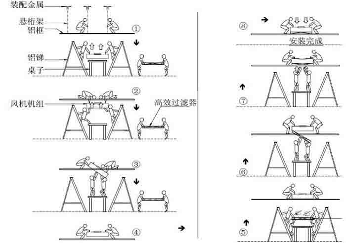 FFU安裝步驟五.在潔凈室內(nèi),抬著高效過濾器的兩位安裝人員把過濾器移交給另外兩位安裝人員,由他們再把過濾器送給上面的兩位人員安裝。