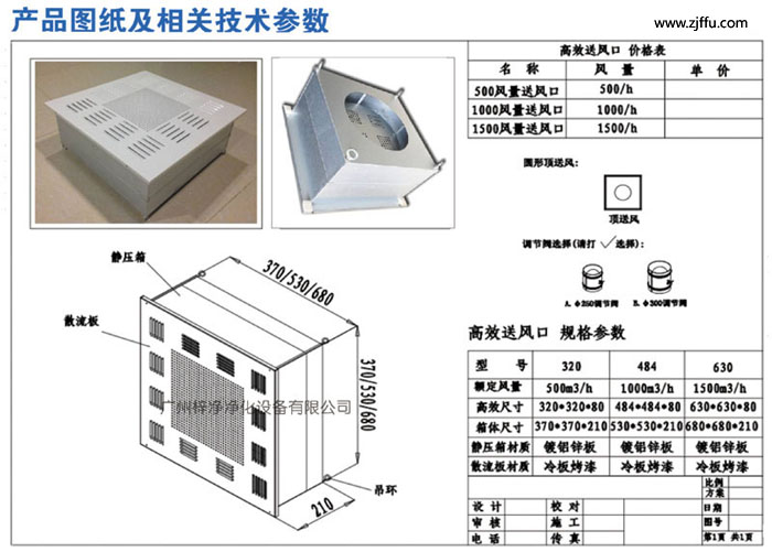 送風(fēng)口箱體尺寸:830×830×400 高效過濾器尺寸:762×762×69額定風(fēng)量1500m3/h